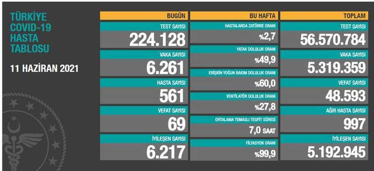 Ülkemizde son 24 saat içerisinde koronavirüs salgınına ilişkin yaşananlar her gün Sağlık Bakanlığı kaynaklarınca açıklanıyor. Açıklamada günlük yapılan test sayısı ile birlikte belirlenen olgu ve vakalar başta olmak üzere koronavirüs hastalarına ilişkin de detayda bilgi veriliyor. 11 Haziran 2021 koronavirüs tablosu da yine belirlenen saatte Sağlık Bakanlığı kaynaklarınca açıklandı. Buna göre;