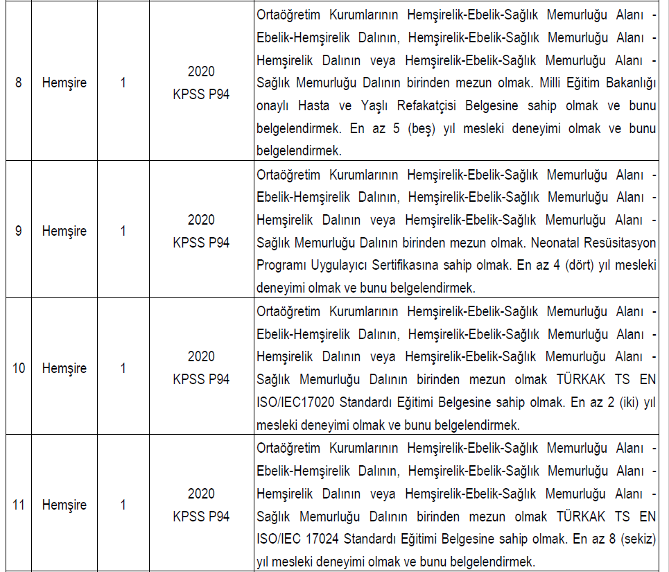 > Adaylar deneyim için e-Devletten alacakları barkodlu SGK Hizmet Dökümünü (Meslek kodunu gösterir) yahut Kurumundan alacağı çalışma zamanını ve unvanını açıkça belirtir ONAYLI çalışma belgesini yüklemeleri gerekmektedir. Staj süreleri mesleki deneyim olarak kabul edilmeyecektir.