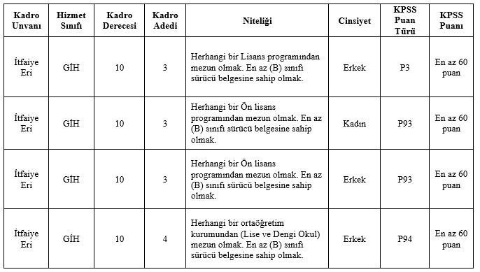 a) İlan edilen İtfaiye Eri kadro unvanı için son kez mezun olunan okul itibariyle öğrenim şartlarını taşımak ve bu öğrenimle alakalı olarak 2020 KPSS (B) grubu sınavına girmiş olmak ve alakalı puan türünden yukarıda tabloda gösterilen asgari puanı almış olmak.