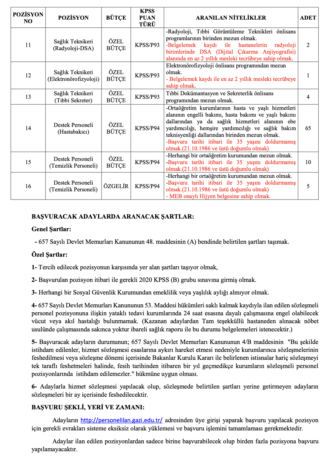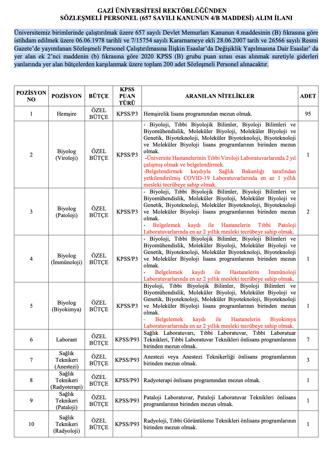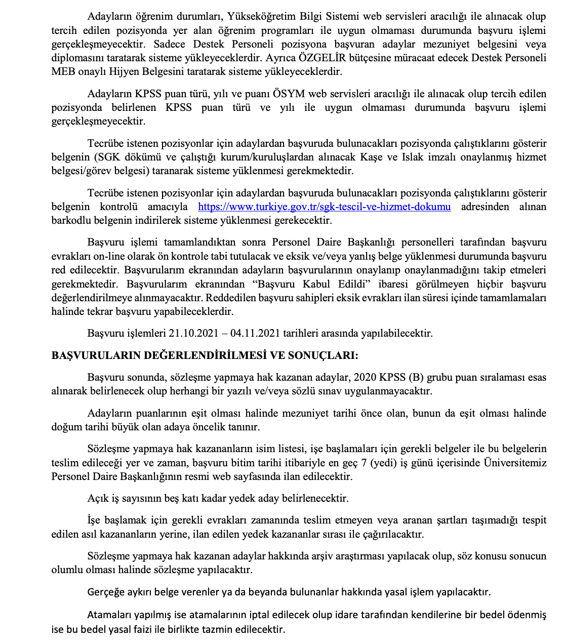 21 Ekim 2021 tarihinde yayımlanan resmi gazetenin 31636 sayısında üniversitemiz birimlerinde çalıştırılmak üzere 657 sayılı Devlet Memurları Kanunun 4.maddesinin (B) fıkrasına göre istihdam edilmek üzere 06.06.1978 tarihli ve 7/15754 sayılı Kararnameye ekli 28.06.2007 tarih ve 26566 sayılı Resmi Gazete’de yayımlanan Sözleşmeli Personel Çalıştırılmasına İlişkin Esaslar’da Değişiklik Yapılmasına Dair Esaslar’ da yer alan ek 2’nci maddenin (b) fıkrasına göre 2020 KPSS (B) grubu puan sırası esas alınmak suretiyle giderleri yanlarında yer alan bütçelerden karşılanmak üzere toplam 200 adet Sözleşmeli Personel alınacaktır.