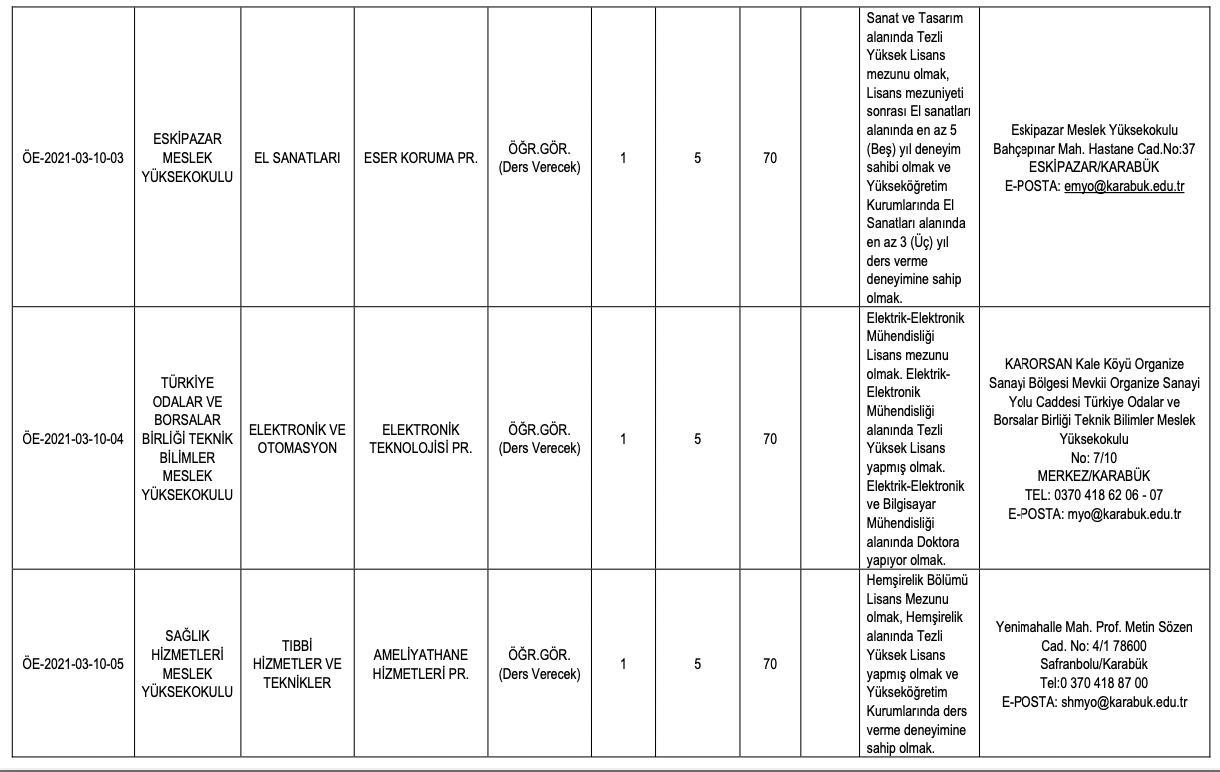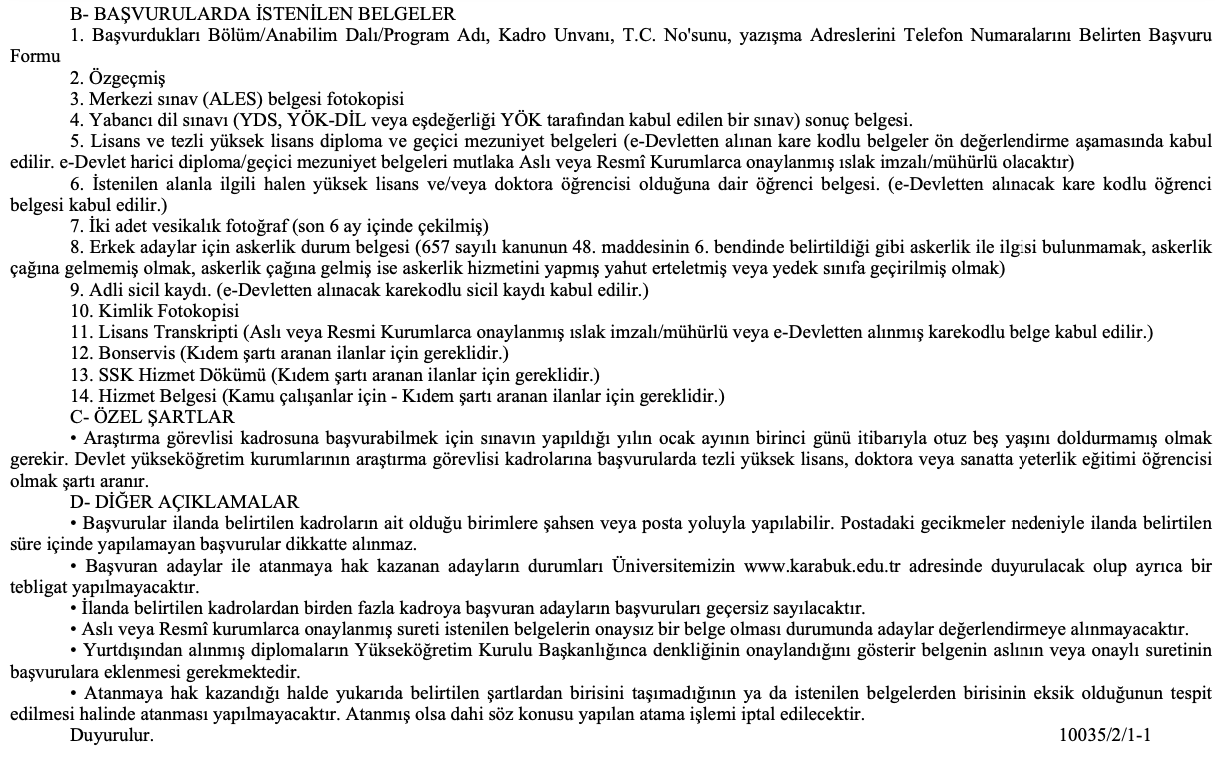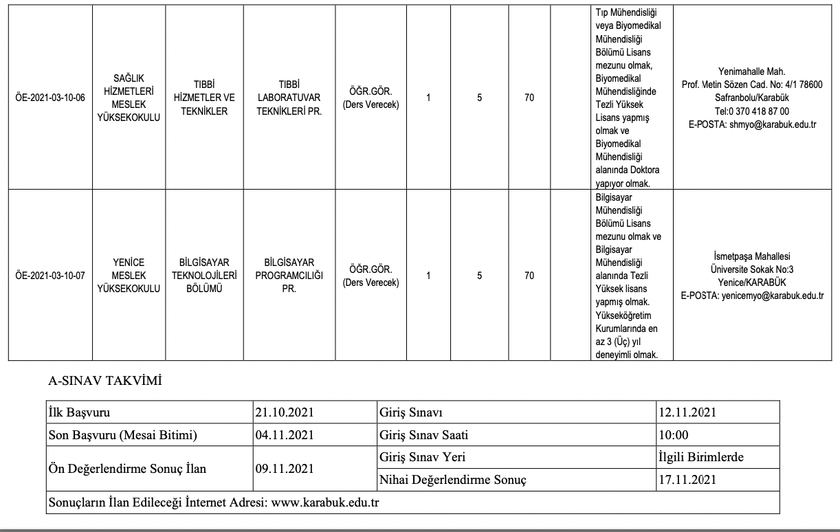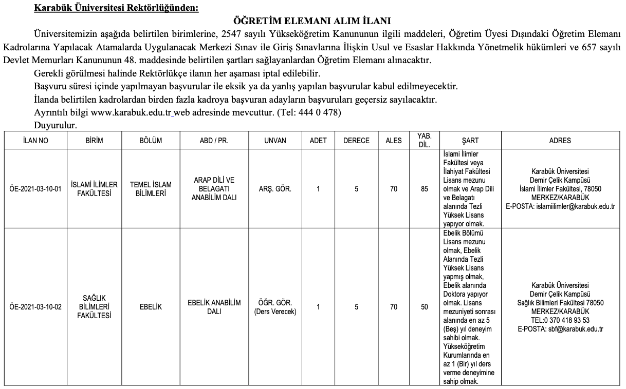 21 Ekim 2021 tarihinde yayımlanan resmi gazetenin 31636 sayısında üniversitemizin aşağıda belirtilen birimlerine, 2547 sayılı Yükseköğretim Kanunu’nun ve Öğretim Üyeliğine Yükseltilme ve Atanma Yönetmeliği’nin ilgili maddeleri, Yükseköğretim Kurulu Başkanlığının web sayfasında yayımlanarak yürürlüğe giren “T.C. Karabük Üniversitesi Öğretim Üyeliğine Yükseltilme ve Atanma Esasları” ile 657 sayılı Devlet Memurları Kanunu’nun 48. maddesinde belirtilen şartları sağlamış olmak koşulu ile öğretim üyesi alınacaktır.