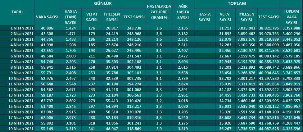 Sağlık Bakanlığı 19 Nisan 2021 tarihli korona virüs verilerini açıkladı.